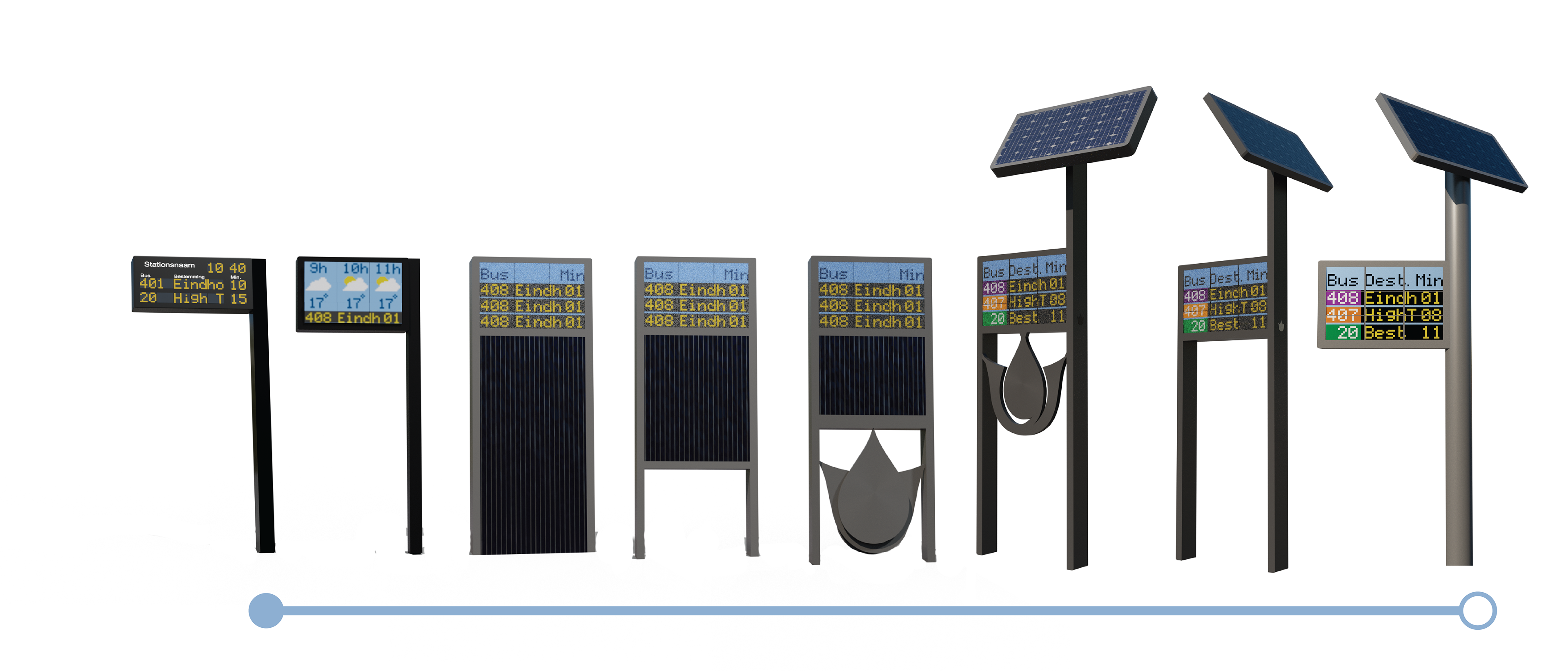 After we set a list of requirements, it was my job to translate this to a visual representation by making 3D renders. By gathering feedback from expert colleagues and possible end-users, the design got improved gradually. Since Etulipa's technology is also constantly improving, the design even got a technology-push which affected the way the display should look. Eventually, we came up with a few design solutions and rated them based on a list of factors (such as adaptability, costs to build, practicality, aesthetics). It resulted in a sleek and minimalistic design solution where the solar panel is separated and can therefore be adjusted in size & direction based on location.