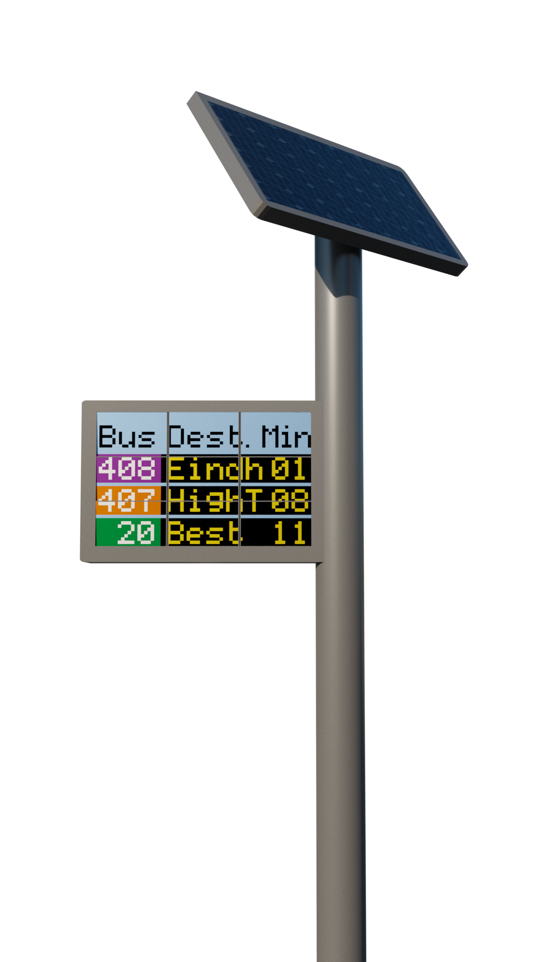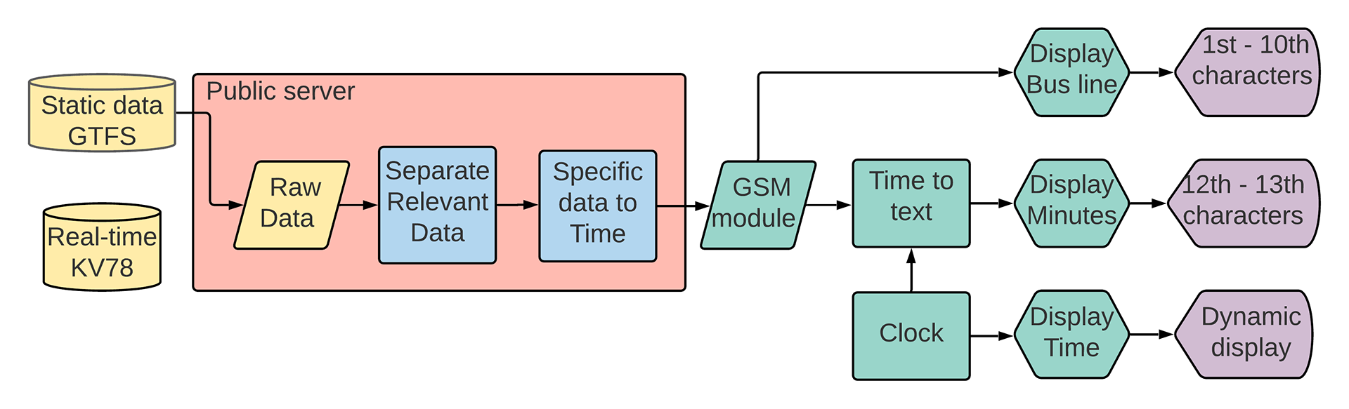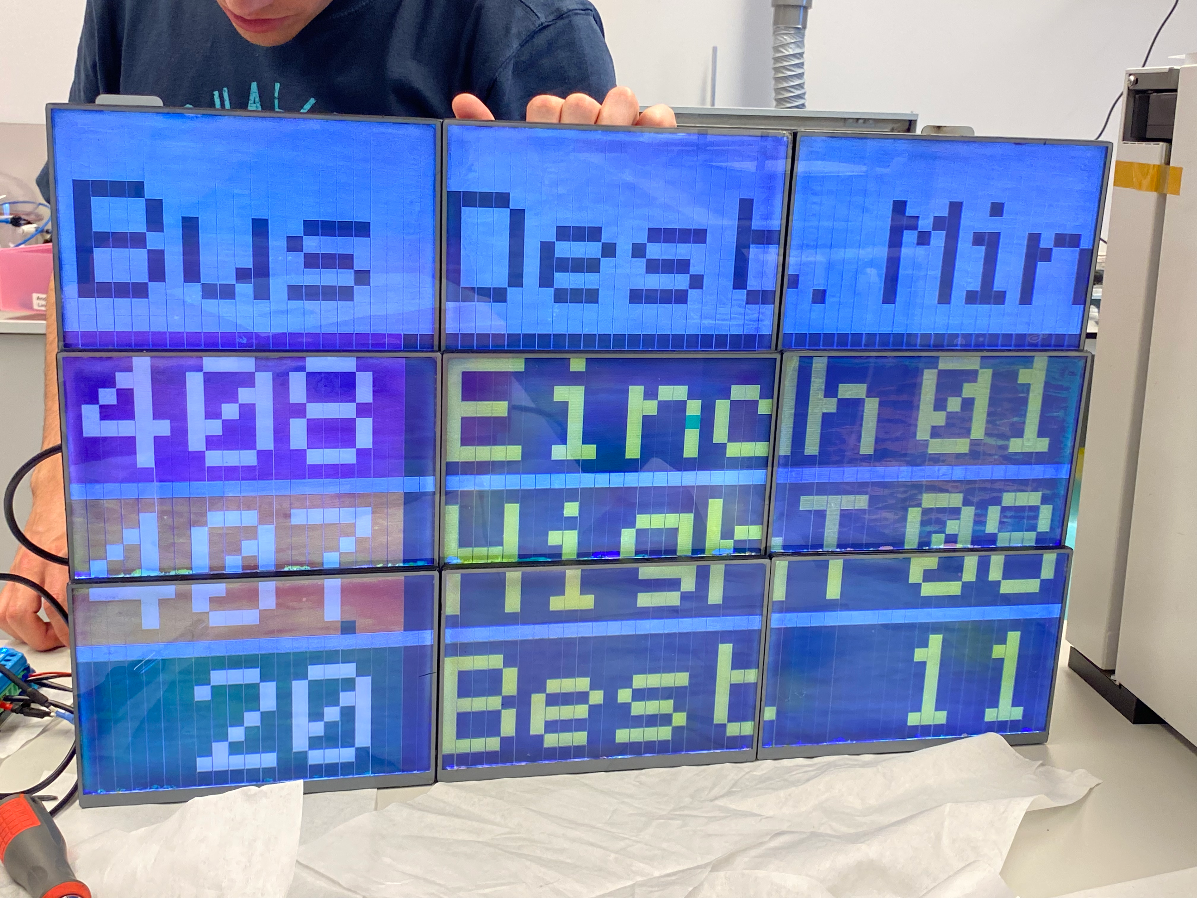 Simultaneously with building the prototype, we are also working on creating a program that sends bus stop data from the buses that pass by bus stop HTC Vijver (next to Etulipa's office). OpenOV provides the bus schedules data of all public transport in the Netherlands. We use Python to filter the data and are currently creating a server that should send this data in the right format to the display. Then the display driver should convert this data to a readable and attractive layout. By doing most computations of the data on the server, the display requires little energy and can run on solar power.