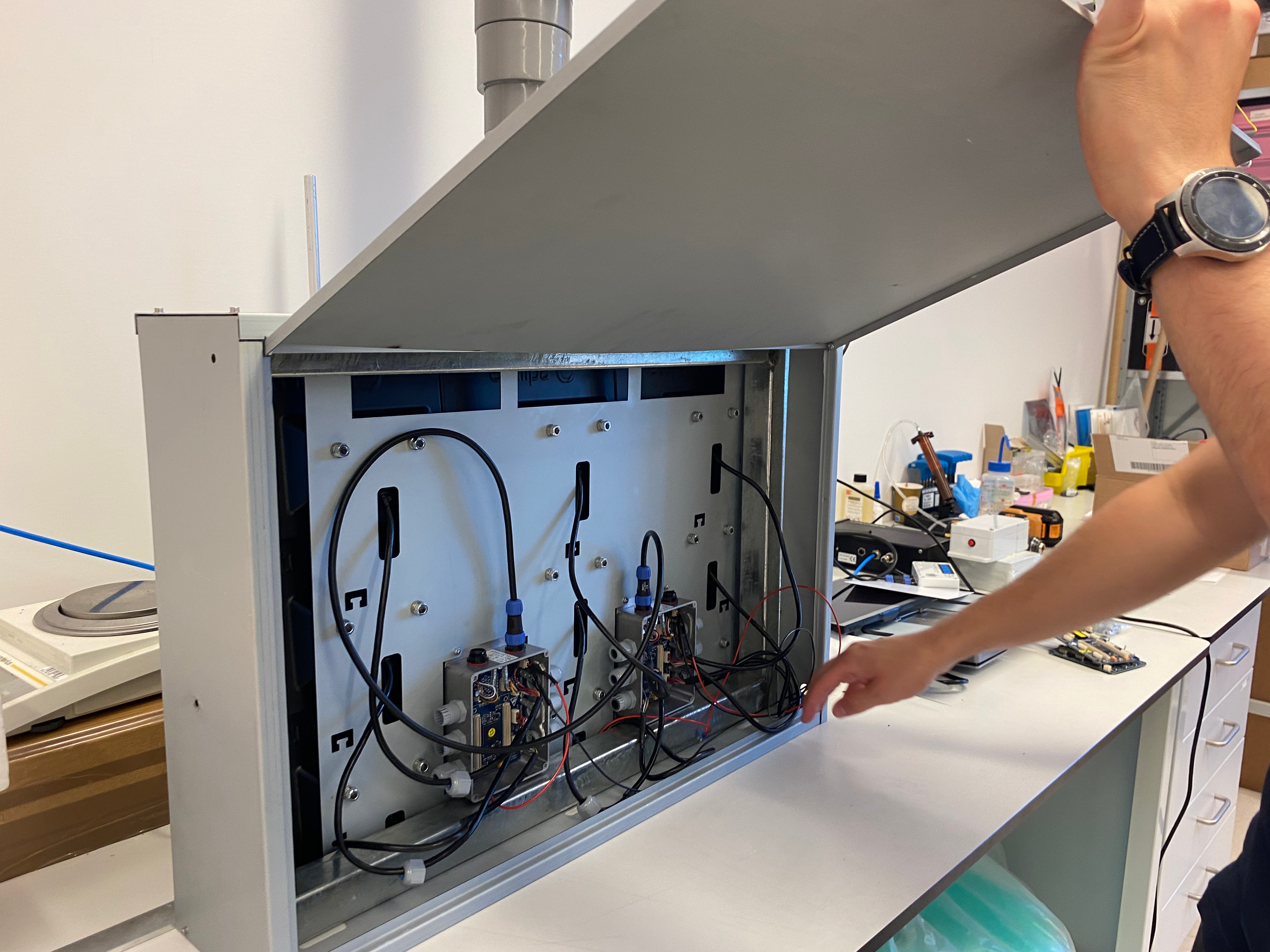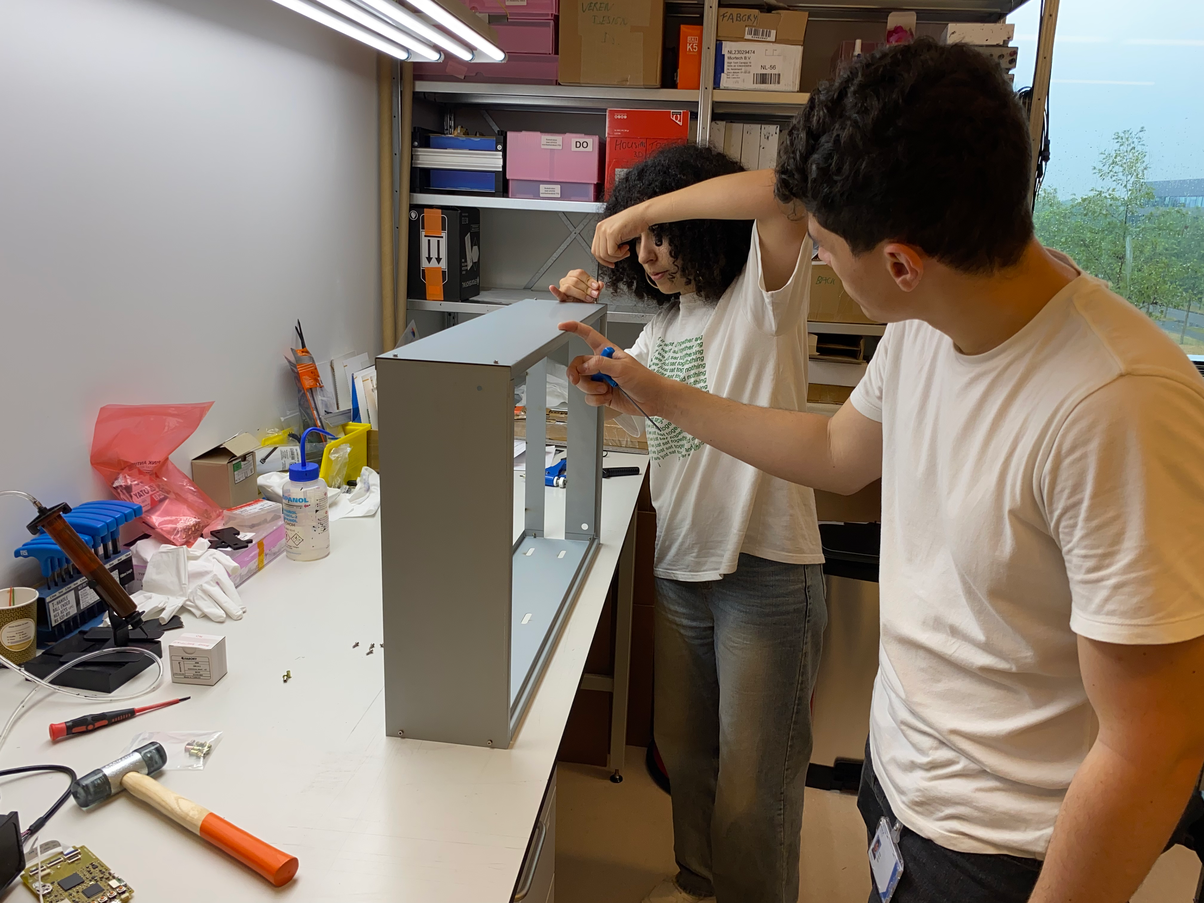 After we ensured all mechanical engineering challenges were solved , we made an inventory of components needed and a plan of prototyping. We did material research to figure out which would be best considering it should be light, but sturdy and withstand different weather conditions. We also had to consider the fact that someone would have to stand on a ladder to put it together, so the assembly should be as simple and light as possible. We decided to first test out all components in the office, before going outside to hang it on the pole.